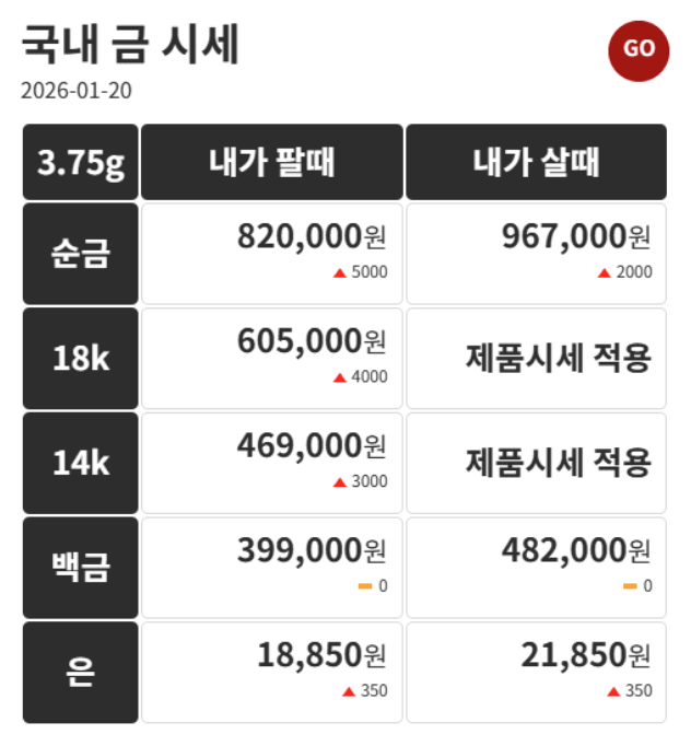 먼저 현재 금 시세를 살펴보면, 금 가격은 매일 변동하며 시장 상황에 따라 지속적으로 조정됩니다. 2026년 1월 20일 기준으로 순금의 판매가는 약 820,000원, 구매가는 약 967,000원 수준으로 형성되어 있습니다. 또한 18K 금은 약 605,000원, 14K 금은 약 469,000원 정도의 가격으로 거래되고 있습니다. 금뿐만 아니라 다른 귀금속의 시세도 함께 움직이는데, 예를 들어 백금의 경우 판매가는 약 399,000원, 구매가는 약 482,000원 정도이며, 은은 판매가 약 18,850원, 구매가 약 21,850원 수준입니다. 이러한 가격은 고정된 것이 아니라 국제 시장의 흐름과 국내 수요 상황에 따라 수시로 변하기 때문에 금을 거래하려는 사람이라면 반드시 당일 시세를 확인하는 것이 중요합니다.